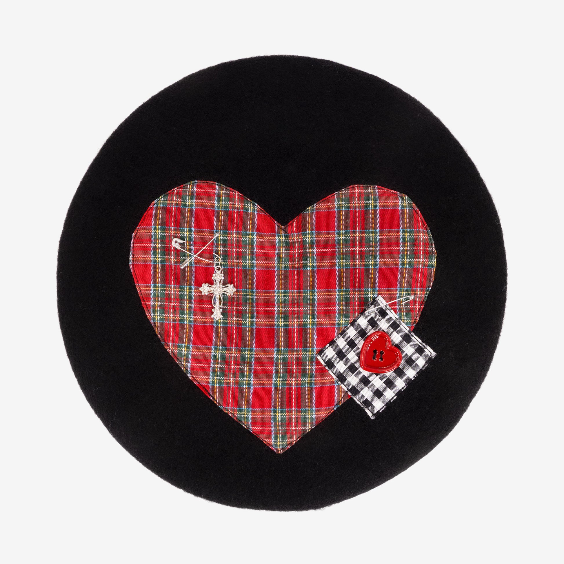 Un béret noir profond rehaussé d’un cœur tartan rouge et d’une mini poche vichy pour un esprit rebelle et affirmé. Son style rappelle les silhouettes rock des scènes alternatives japonaises, là où la musique résonne fort et les looks ne passent jamais inaperçus. Un clin d'œil discret aux fans de groupes de légende… mais seuls les vrais sauront.