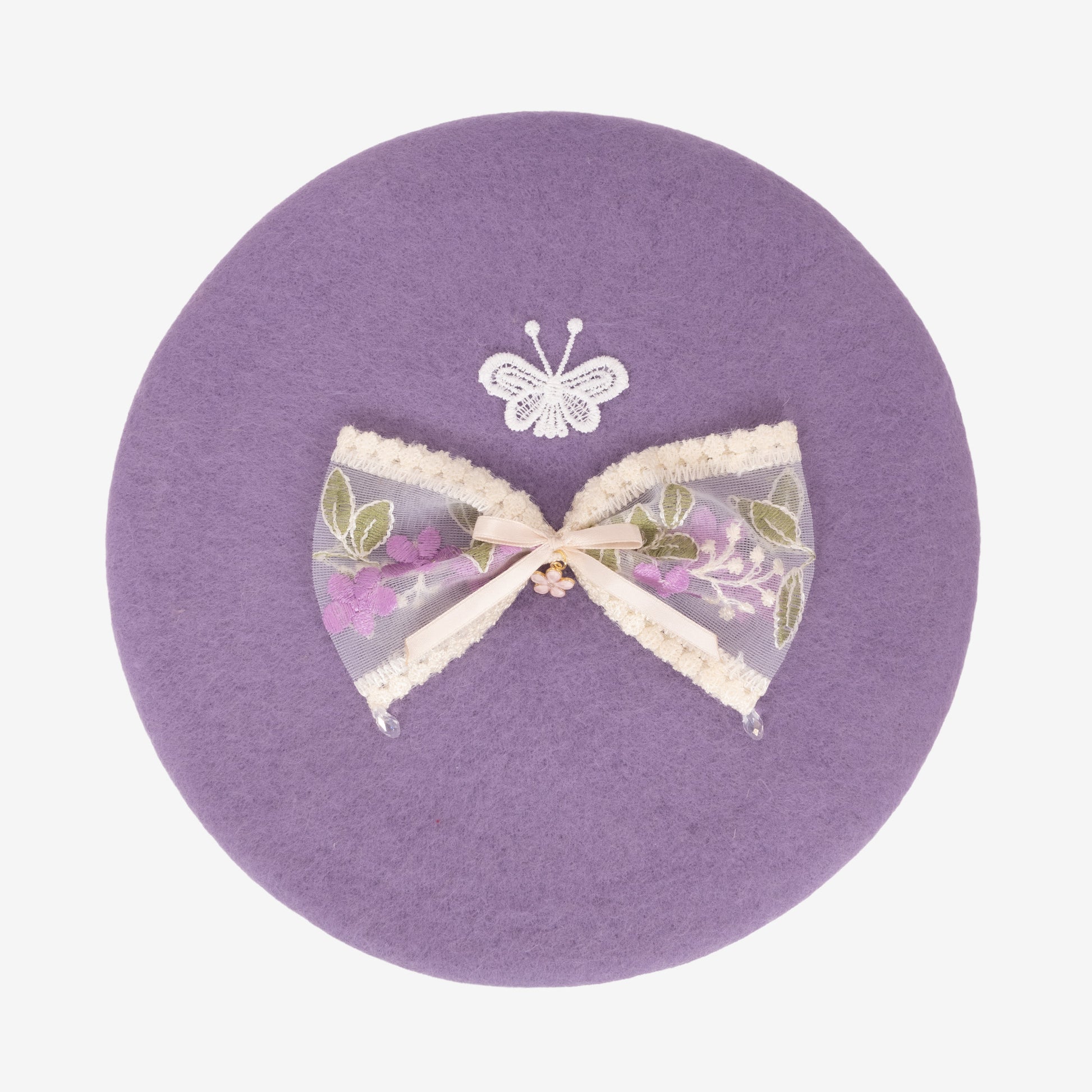 Un souffle de poésie dans un camaïeu de lavande. Ce béret tout en délicatesse mêle dentelle florale brodée, petit papillon et ruban crème pour une allure douce et romantique. Parfait pour celles et ceux qui aiment les détails subtils et les inspirations féériques.