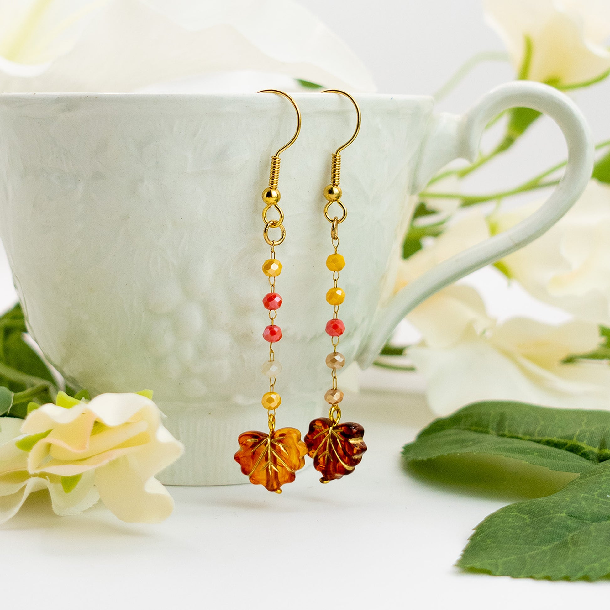 Un dégradé de perles chaudes aux teintes orangées, rouges et ambrées, terminé par une feuille sculptée. Une paire pleine de charme, comme un souvenir doré d’une promenade en forêt.
