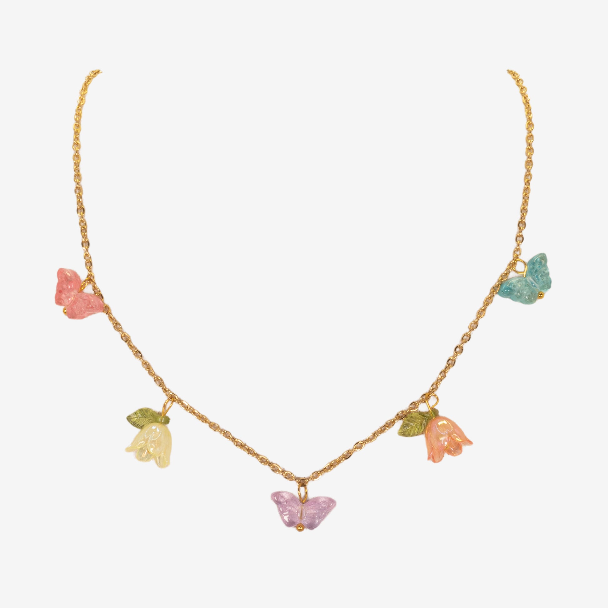 Un collier tout droit sorti d’un jardin enchanté, où papillons pastel et petites clochettes fleuries dansent autour de ton cou. Léger, poétique et coloré, il capture l’esprit du printemps éternel de Petit Pot Tam.