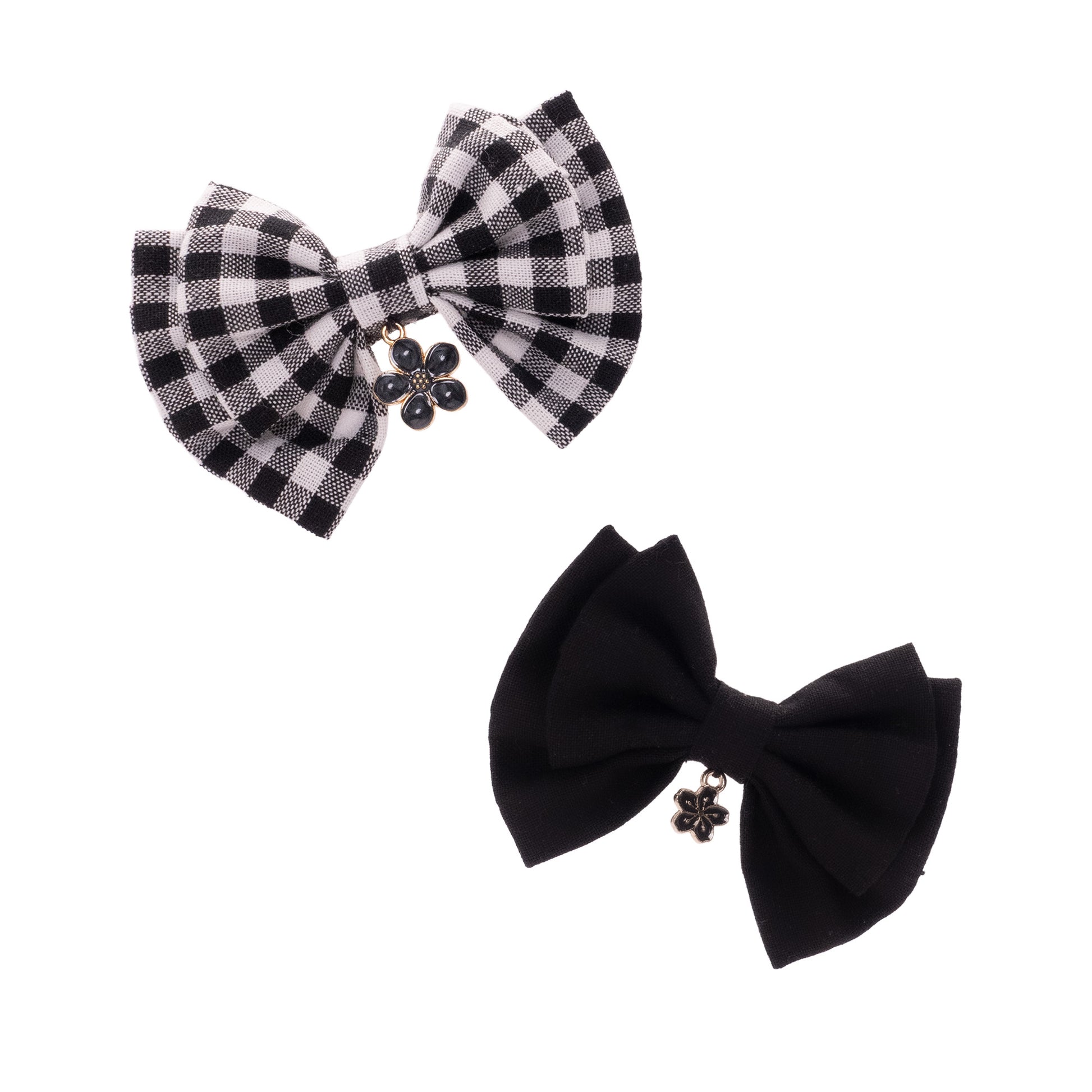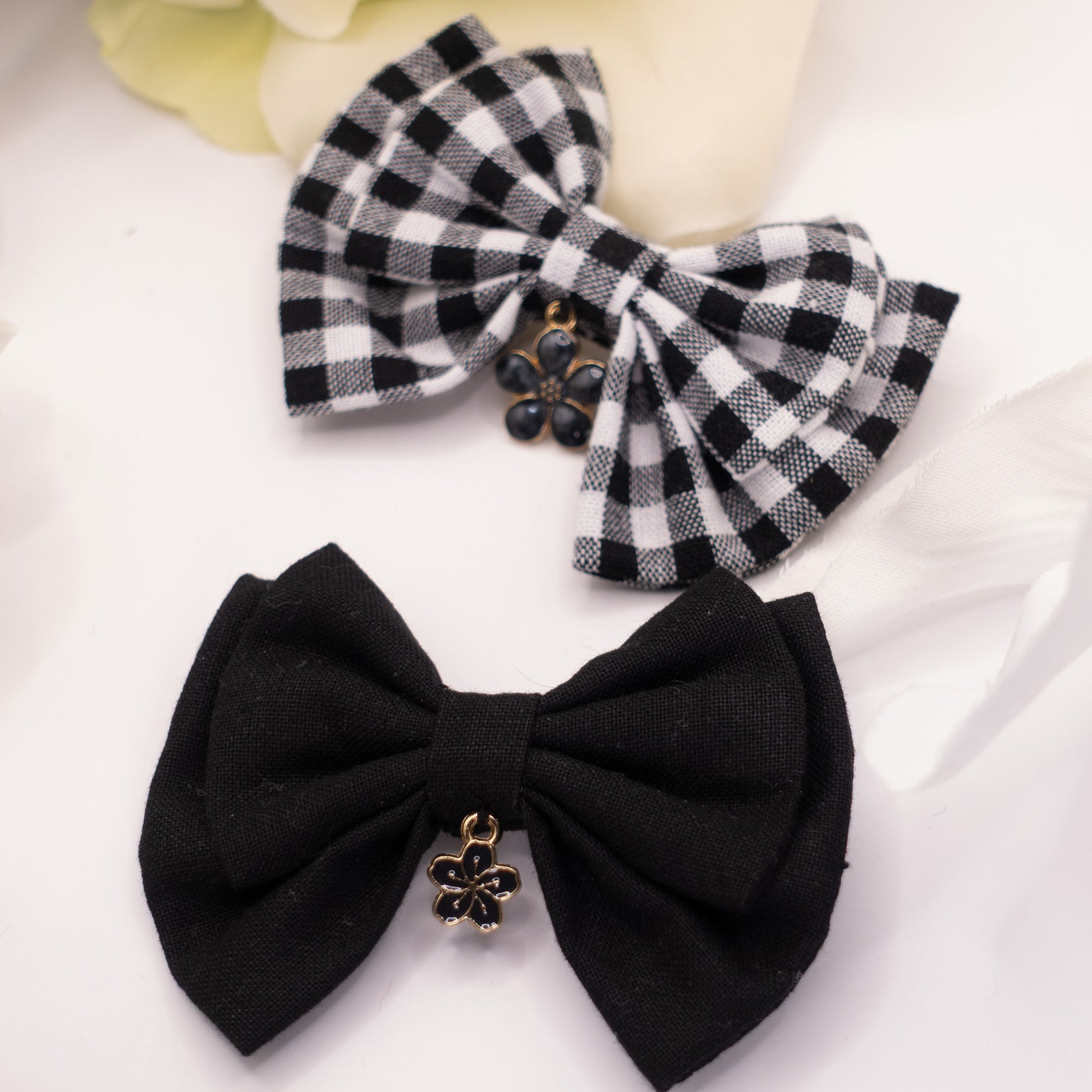 Un duo plein de contraste et d’élégance, parfait pour sublimer une tenue romantique, preppy ou un peu dark. Le motif vichy noir et blanc s’accompagne d’un petit bijou floral en perles sombres, pendant que le second nœud, entièrement noir, affirme un style épuré mais raffiné.