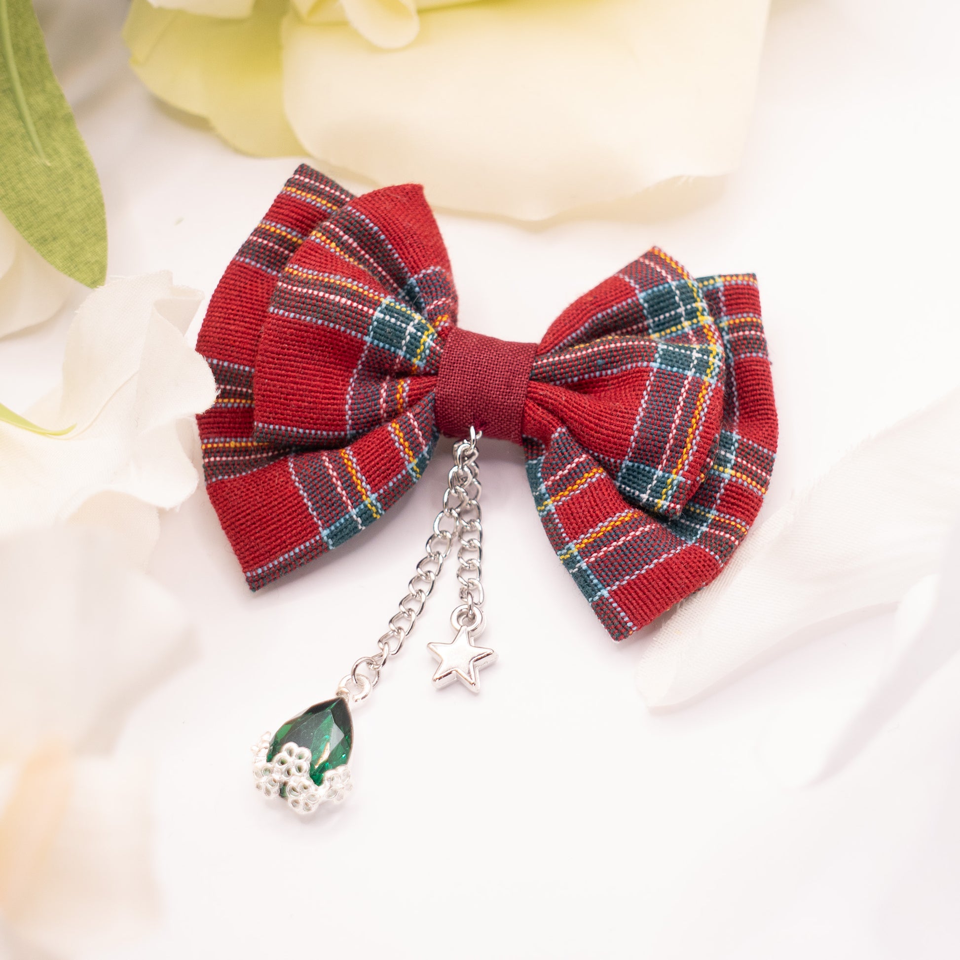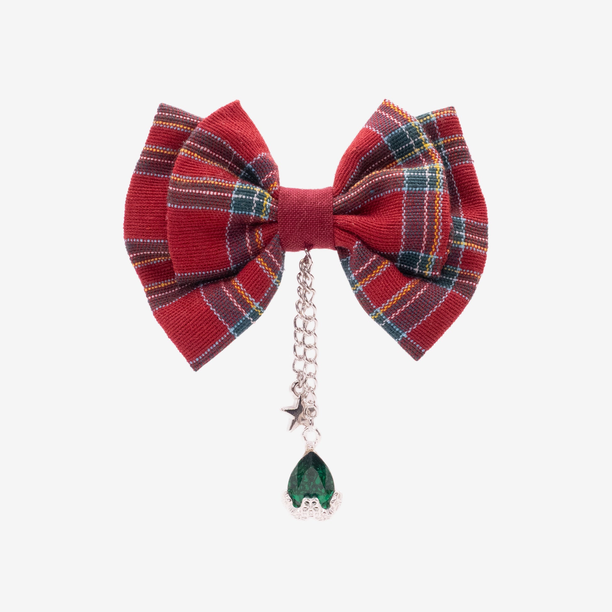Un petit nœud au charme punk et délicat, inspiré par l’iconique Nana Osaki. Son tissu tartan rouge profond évoque l’univers rock et romantique du manga, tandis que le pendant en goutte émeraude apporte une touche précieuse et mystérieuse. C’est un clin d’œil à celles qui, comme Nana, cachent une douceur derrière une allure affirmée.