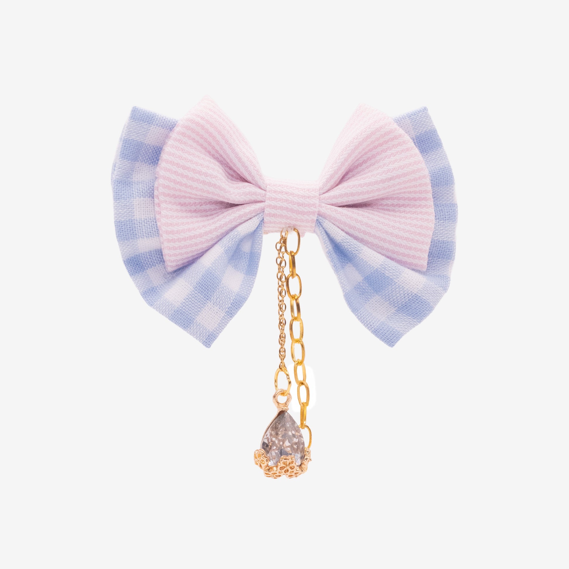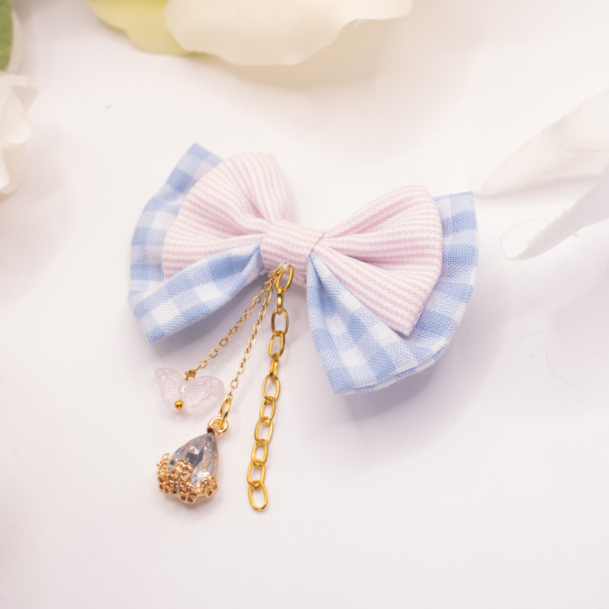 Un petit nœud tout en douceur, inspiré par les matins clairs et les rêves cotonneux. Son tissu vichy bleu ciel contraste délicatement avec le centre rayé rose pâle, pour une allure douce et rétro. Le pendentif en cristal transparent, suspendu à une fine chaîne dorée, capte la lumière avec subtilité — une touche élégante à glisser dans les cheveux pour illuminer une tenue kawaii ou romantique.