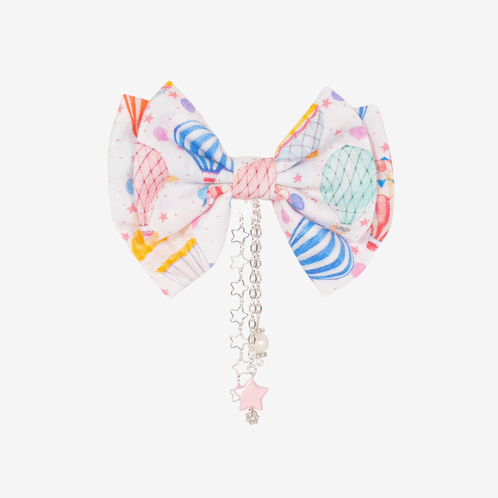 Un imprimé de montgolfières multicolores et un pendentif étoilé pour un look plein de légèreté. Ce nœud te donne envie de t’envoler la tête dans les nuages.