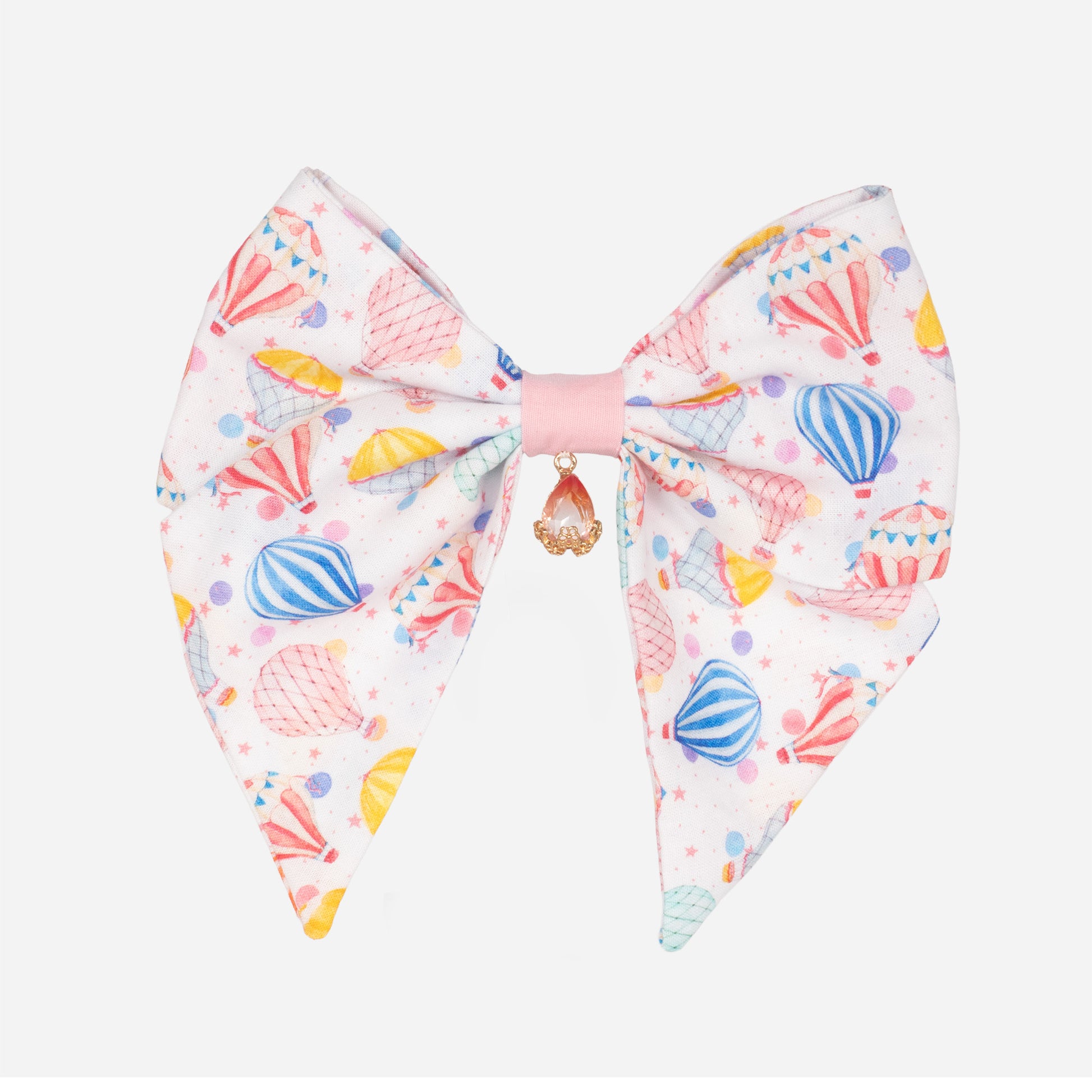 Inspiré d’un ciel de fête foraine, ce grand nœud coloré est orné de montgolfières pastel qui donnent une impression de légèreté et de rêverie. Son pendentif en cristal aux nuances dégradées ajoute une touche féerique à cette pièce pleine de douceur.