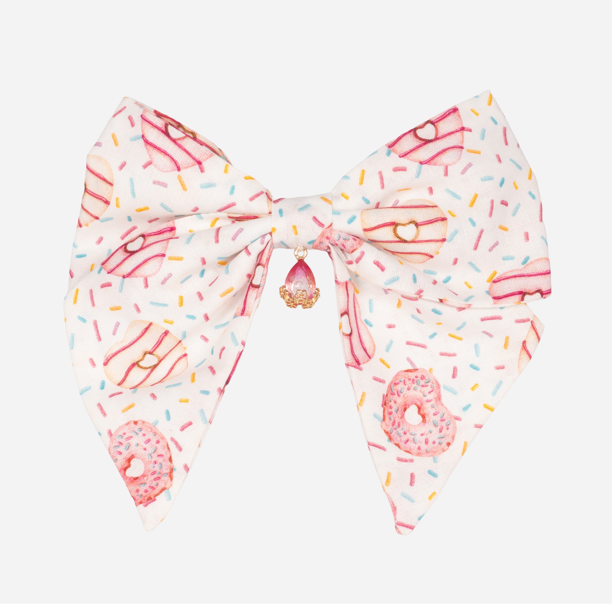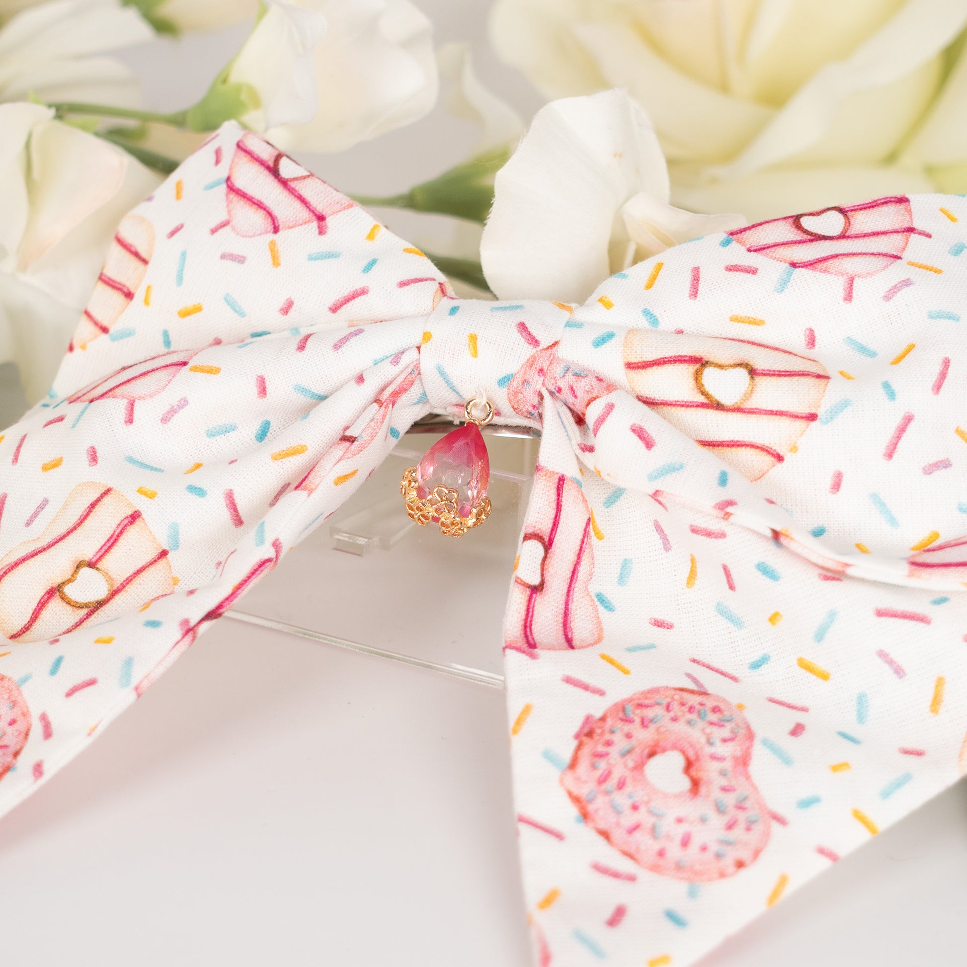 Un concentré de douceur et de fun avec ce nœud. Ses donuts roses nappés de sucre et ses éclats multicolores rappellent l’univers pastel d’une pâtisserie kawaii. En son centre, un cristal rose dégradé brille délicatement, comme une cerise sur le gâteau.