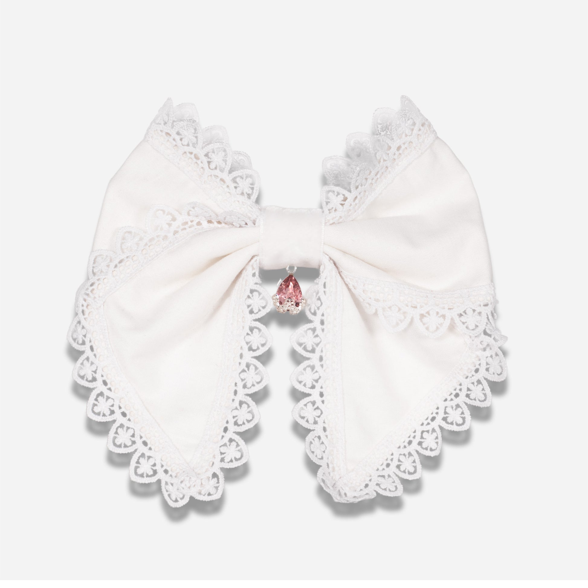 Un grand nœud immaculé bordé de délicates dentelles pour un look résolument romantique et raffiné. Son pendentif rose ajoute juste ce qu’il faut de brillance pour capturer la lumière… et les regards.
