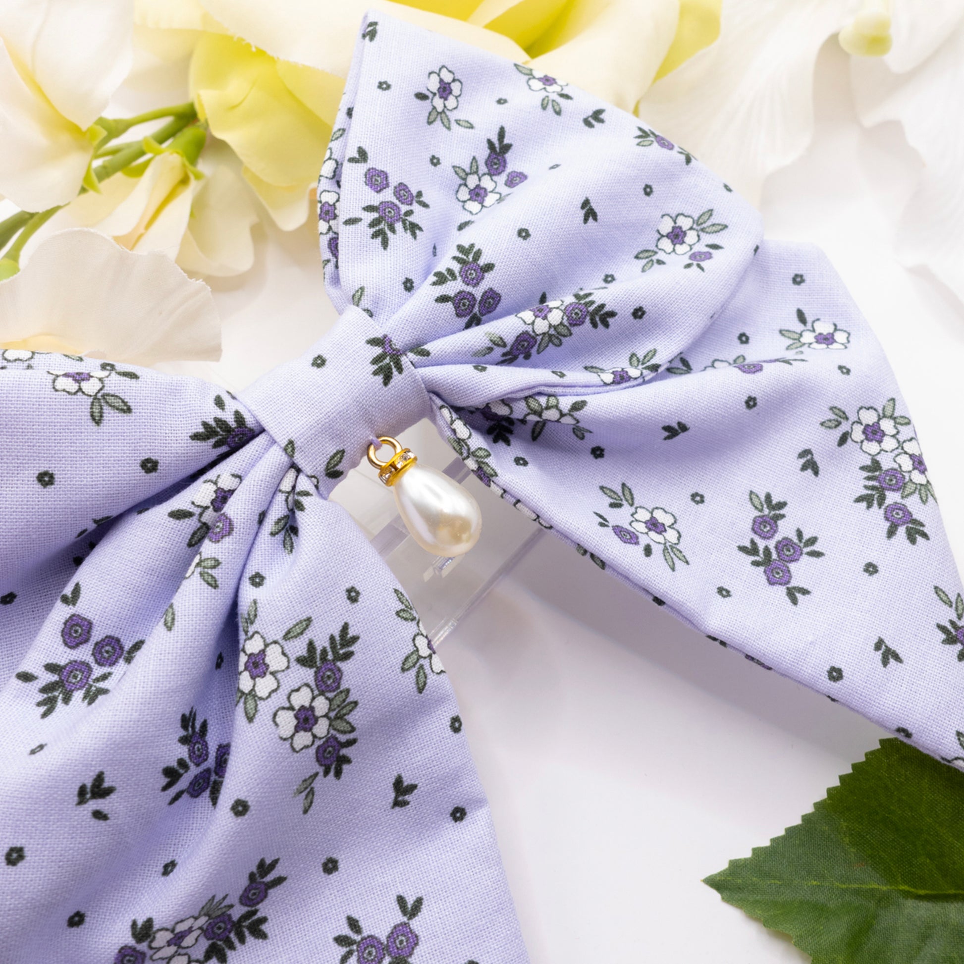 Un nœud en tissu fleuri aux teintes lilas, délicatement orné d’une petite perle. Une touche romantique et légère pour sublimer ta coiffure.