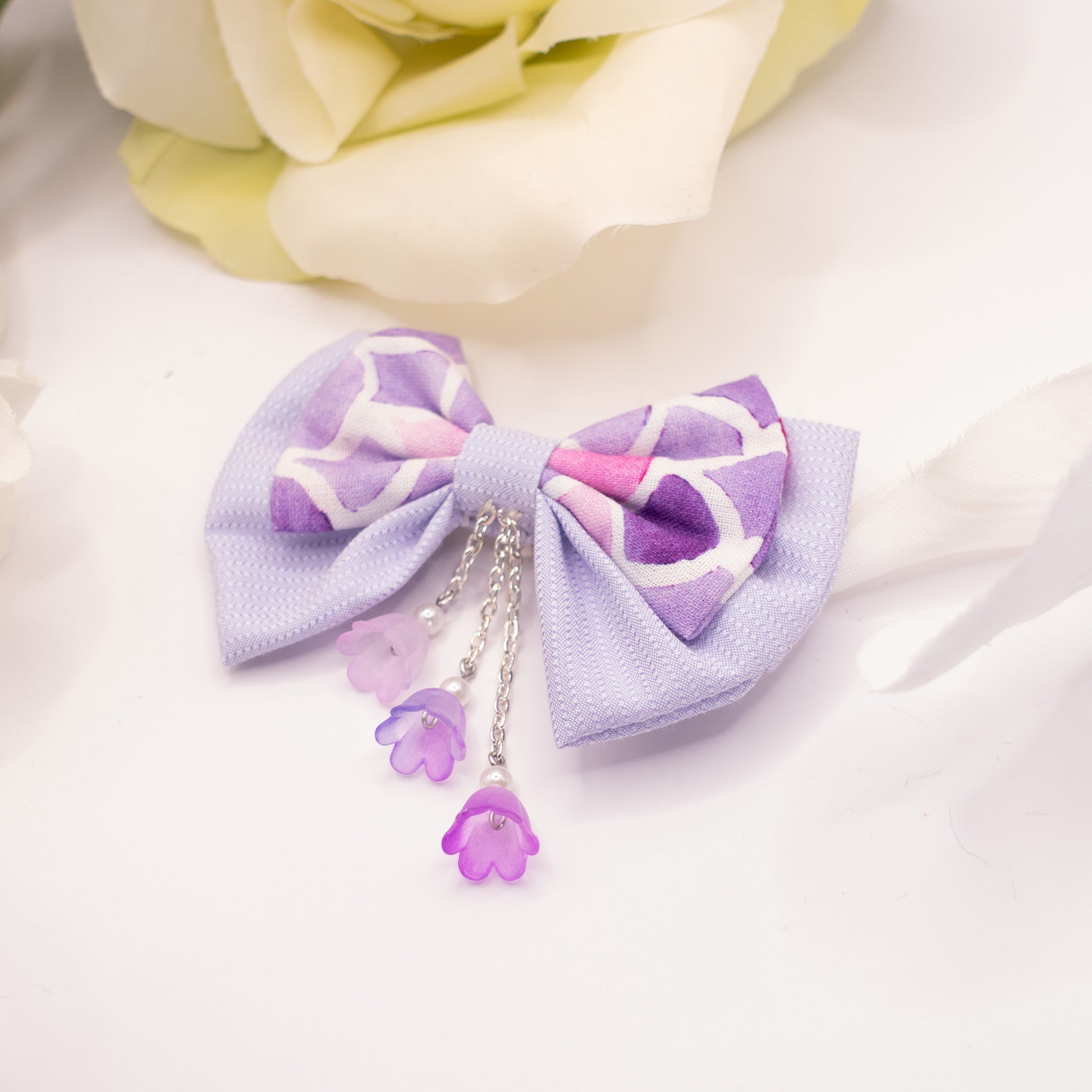 Un petit trésor fleuri inspiré des profondeurs enchantées. Avec ses pétales dégradés violets et roses en forme de clochettes, ce nœud évoque un jardin sous-marin magique. Son tissu aux motifs d’écailles dans des tons lavande, rose et blanc lui donne une allure douce et mystérieuse, parfaite pour celles qui rêvent d’un univers féérique entre terre et mer.