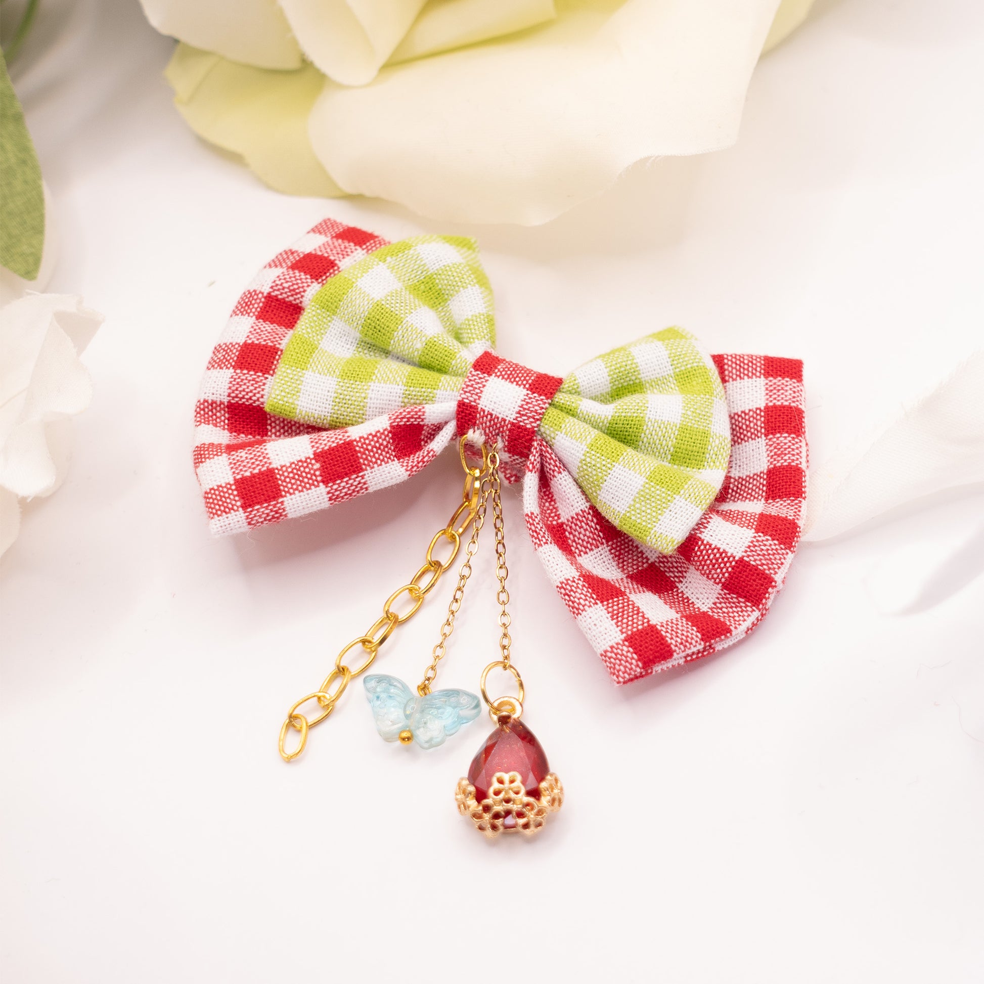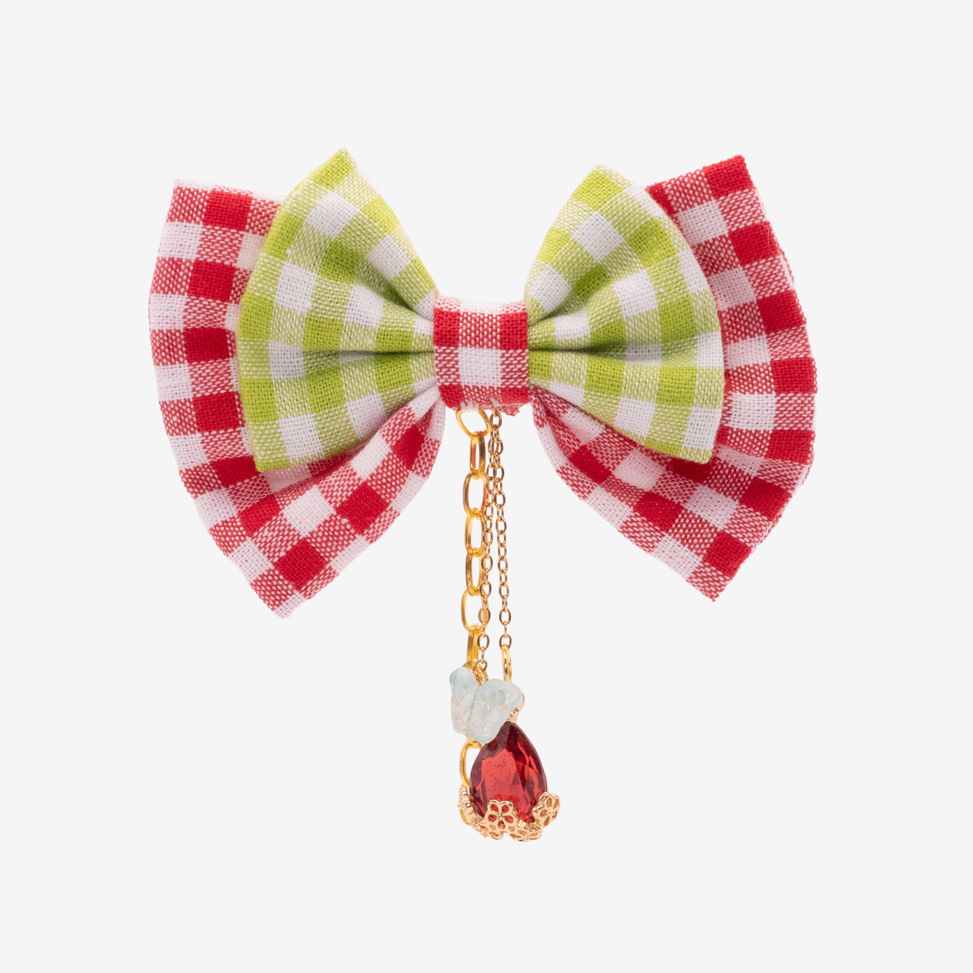 Un petit nœud au charme estival, inspiré des goûters sur l’herbe et des paniers garnis de fruits rouges. Le contraste entre le vichy rouge cerise et le vert pomme crée une ambiance rafraîchissante et joyeuse, parfaite pour ajouter une touche de fantaisie rétro à ta coiffure. Le pendentif doré, orné d’un cristal rouge profond et d’un papillon bleu ciel, apporte une note délicate et gourmande à l’ensemble.