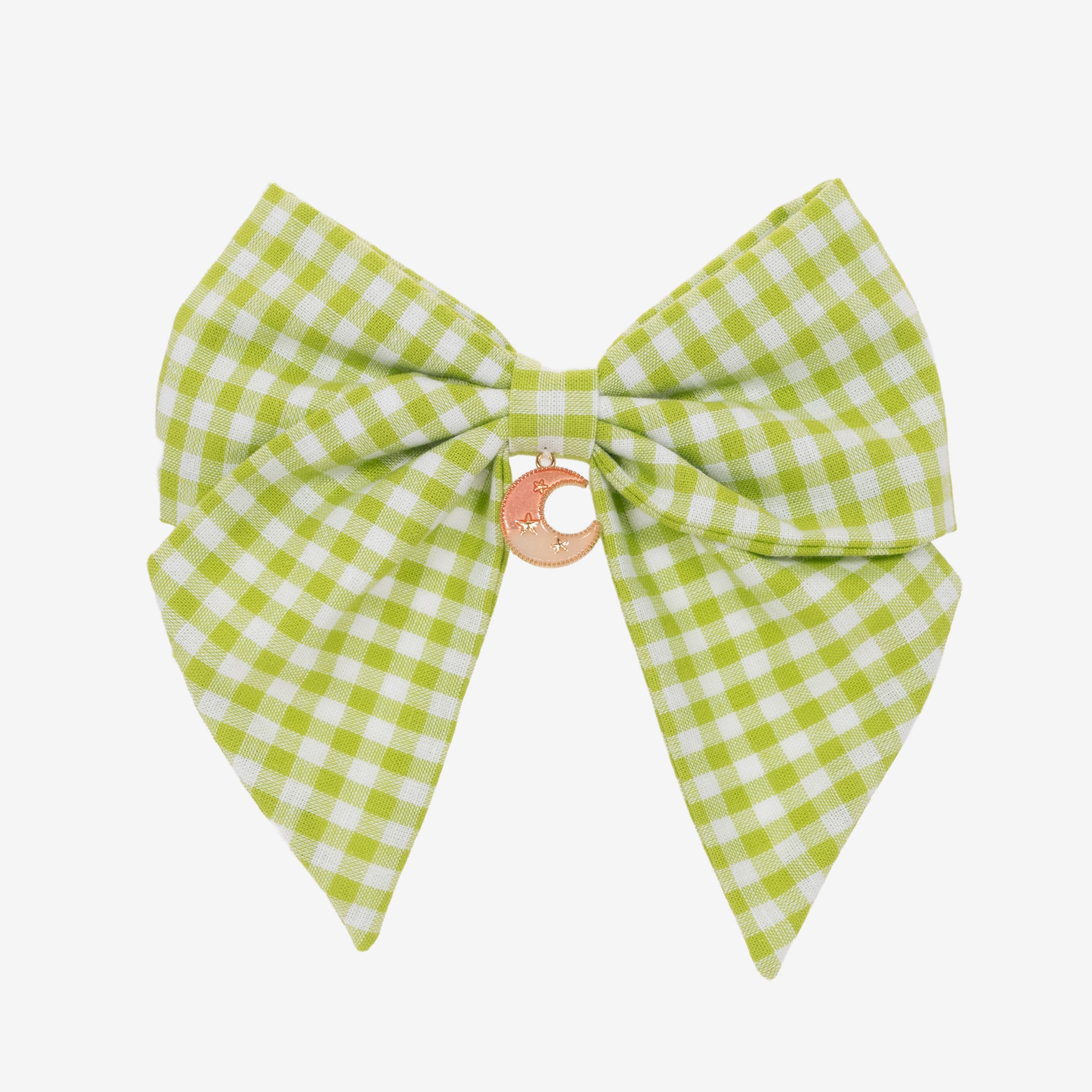 Un soupçon de magie pour compléter une tenue fruitée. Ce nœud à carreaux vichy vert pomme est orné d’un petit croissant de lune doré, pour une touche céleste discrète et poétique. À porter dans les cheveux ou en accessoire de vêtement.