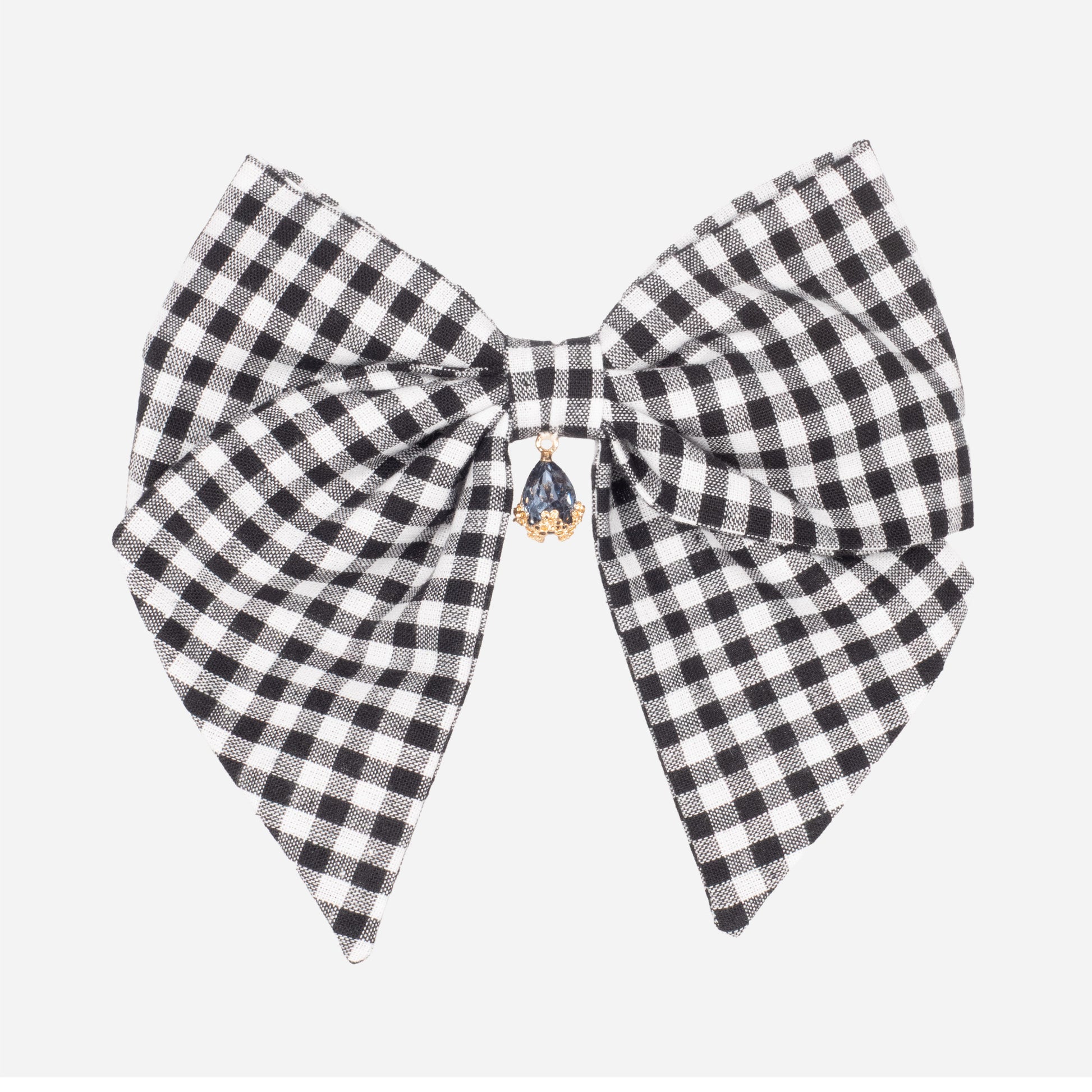 Un intemporel au charme rétro ! Ce grand nœud en tissu vichy noir et blanc est rehaussé d’un pendentif cristal gris, pour un look à la fois doux, graphique et élégant.