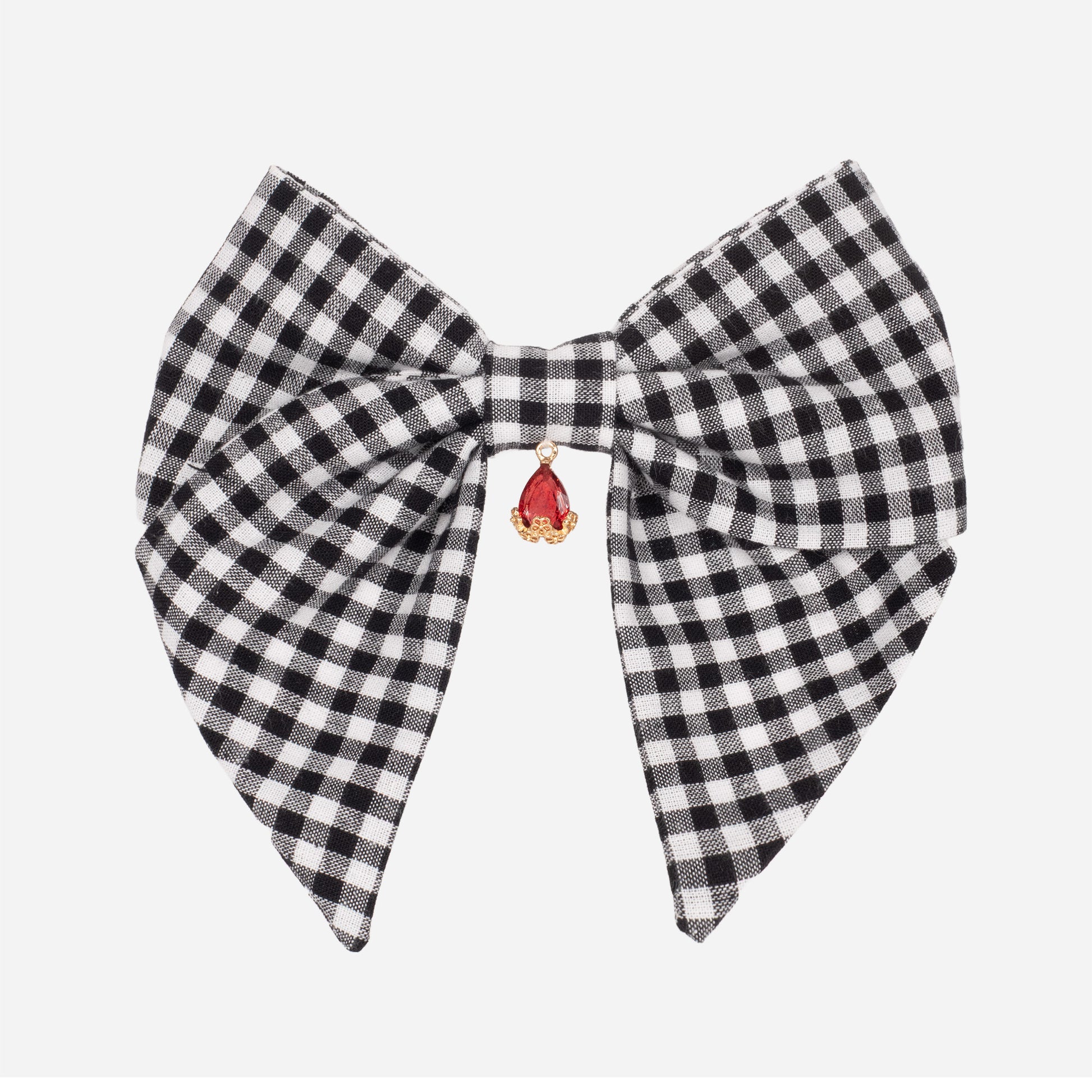 Un classique revisité avec une touche de passion. Ce grand nœud en coton vichy noir et blanc incarne une élégance rétro intemporelle, rehaussée par un cristal rouge éclatant suspendu au centre. Il apporte instantanément du caractère à une tenue, tout en conservant un charme doux et sophistiqué.